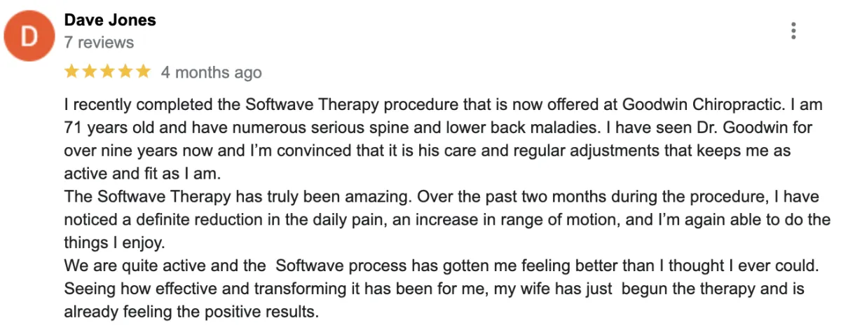 As part of this SoftWave™ Therapy special, you will receive the following at your appointment at Goodwin Chiropractic: